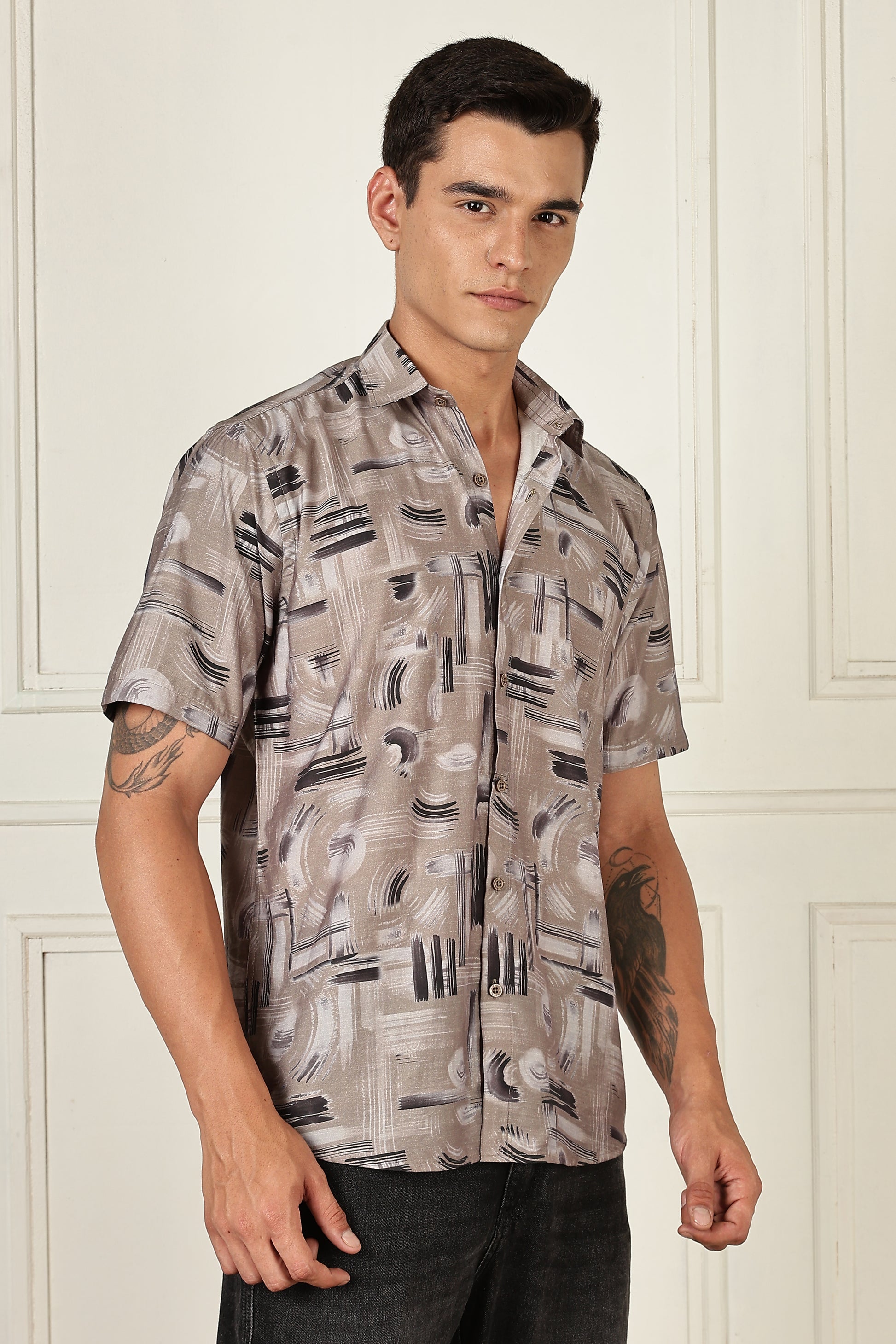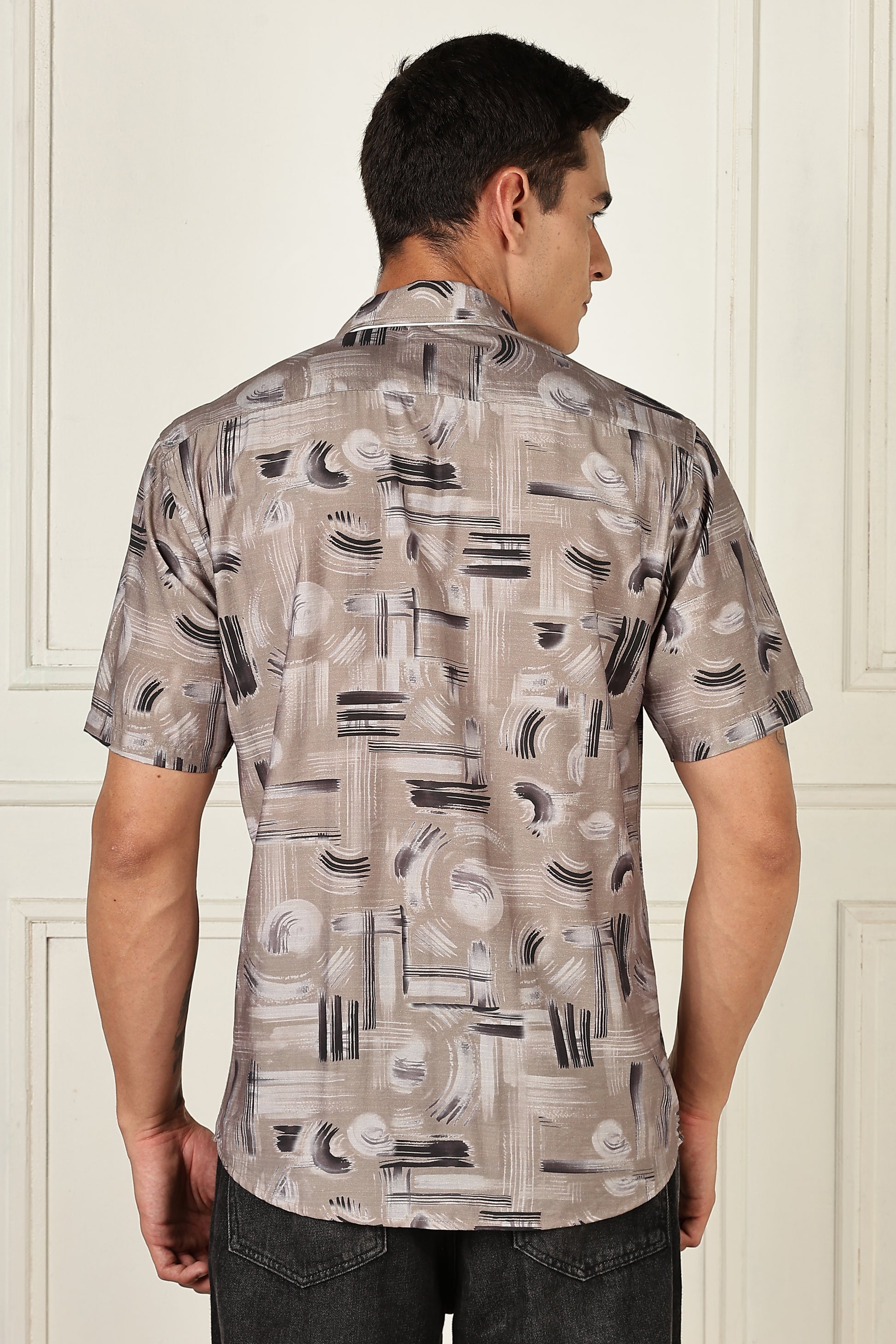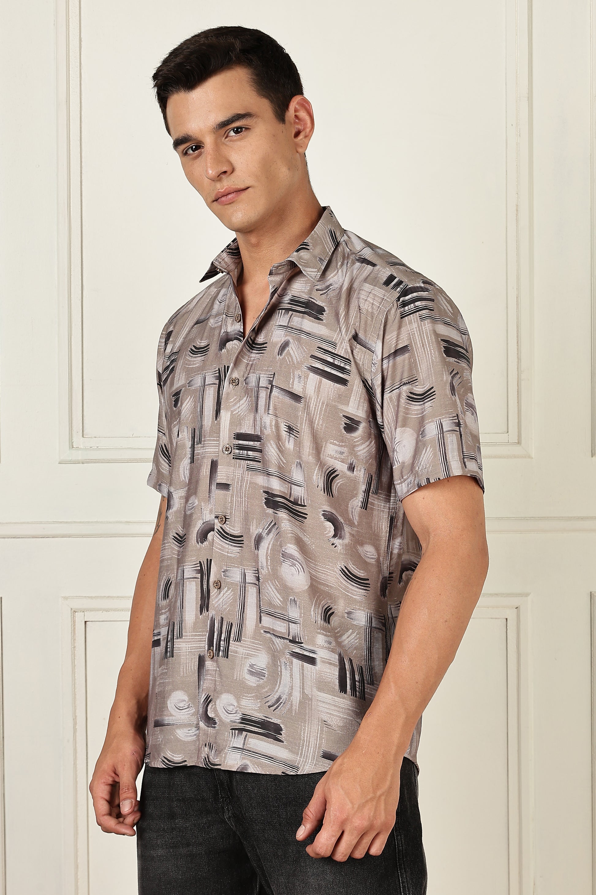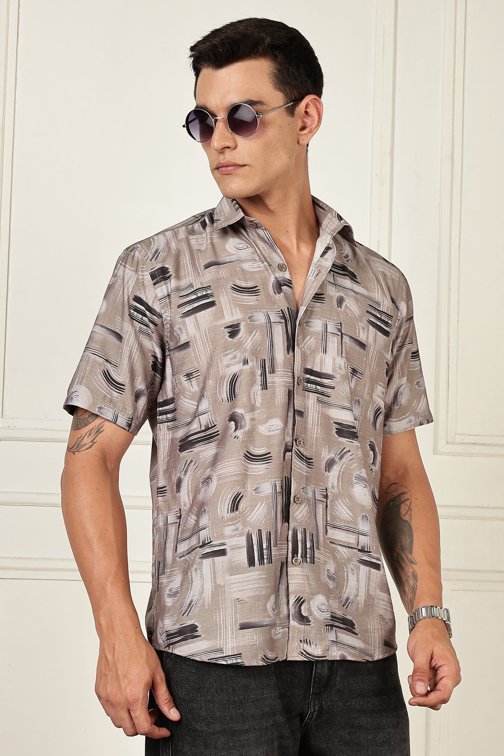 Understated art for every day. This short-sleeve shirt features a refined mix of painterly swirls and stacked lines on a taupe stone base, giving quiet texture without feeling loud. A neat collar and clean button front keep it sharp, while the lightweight woven feel stays comfortable from desk to dinner. Pair it with black denim or chinos for effortless smart-casual style.