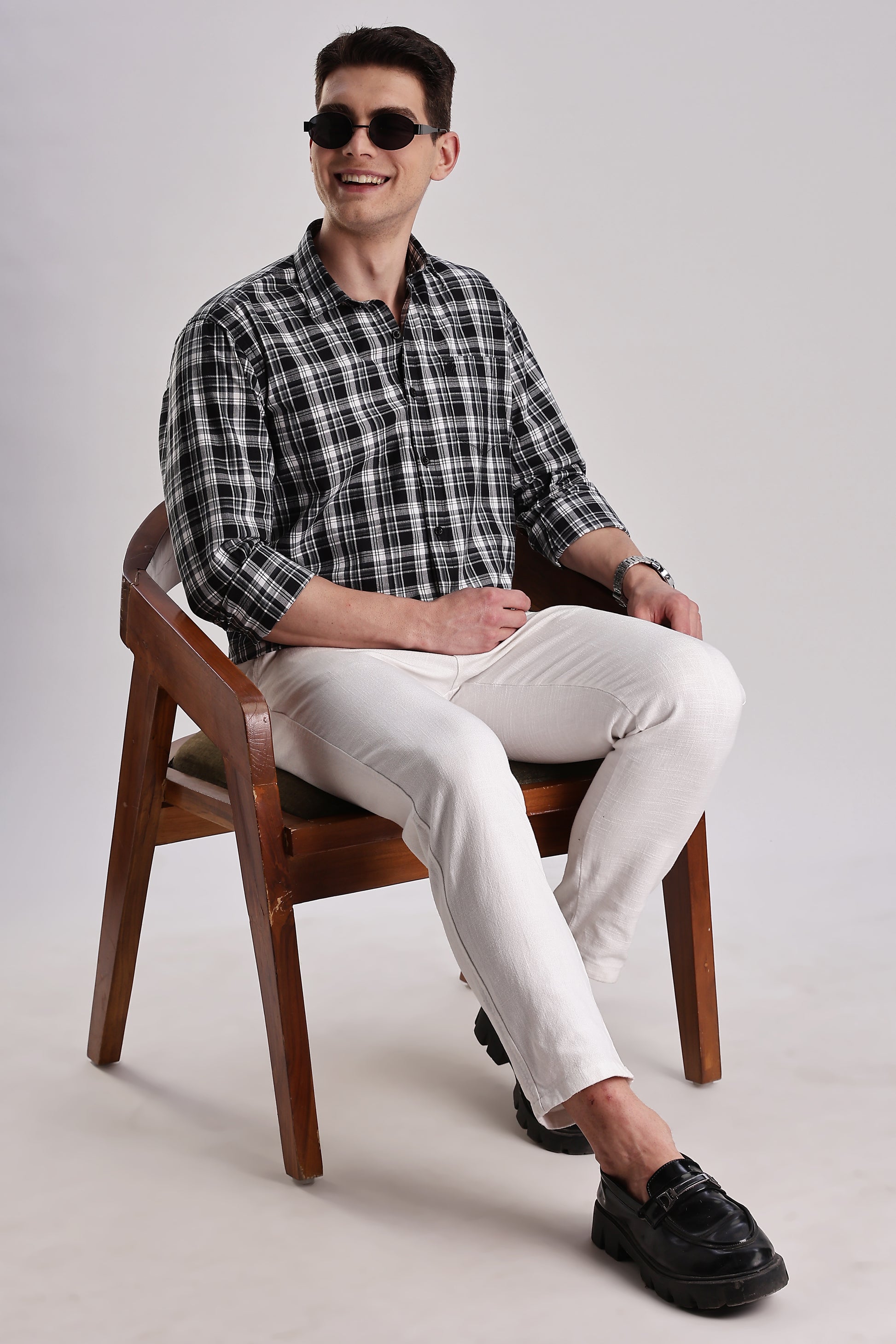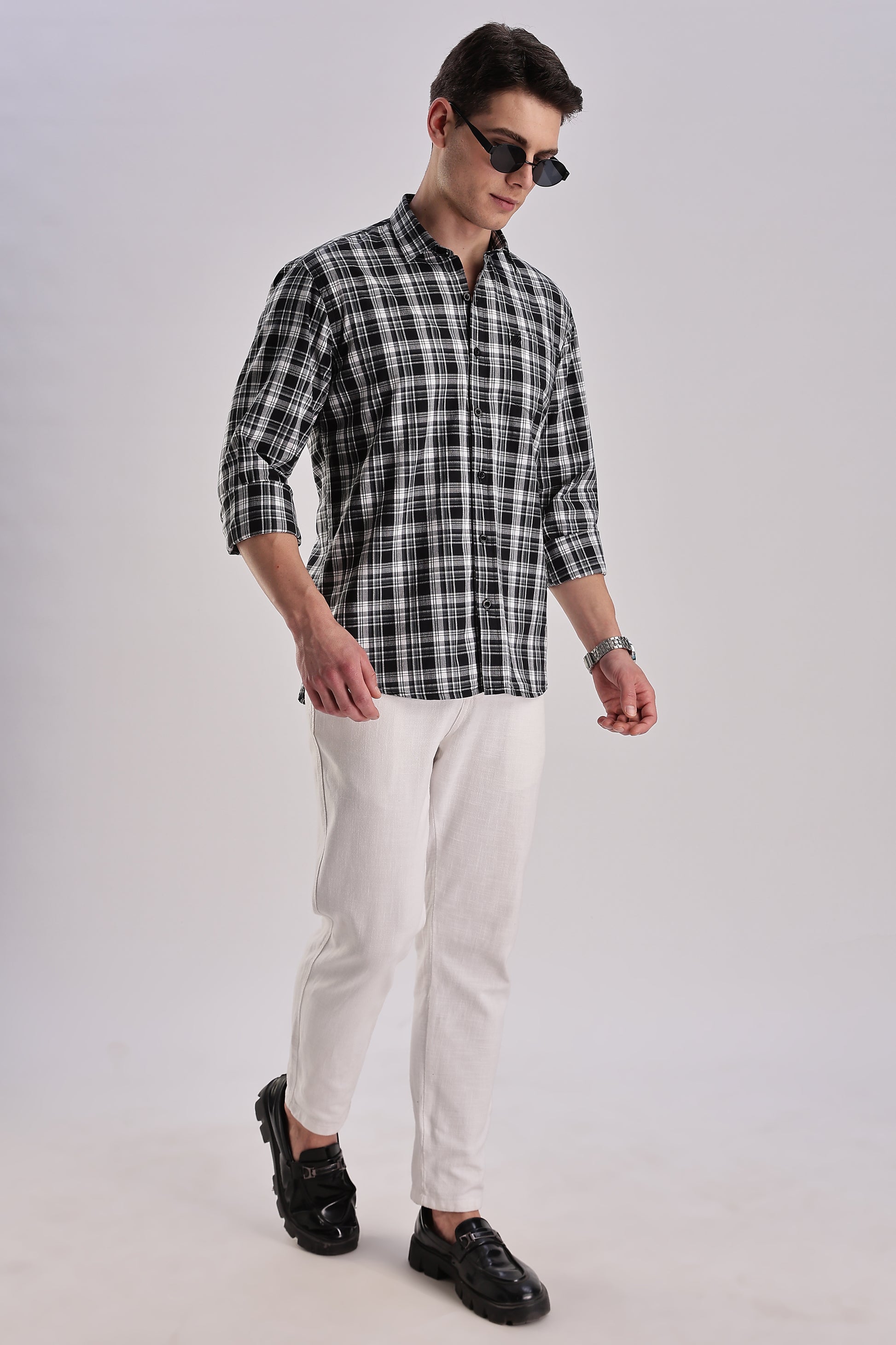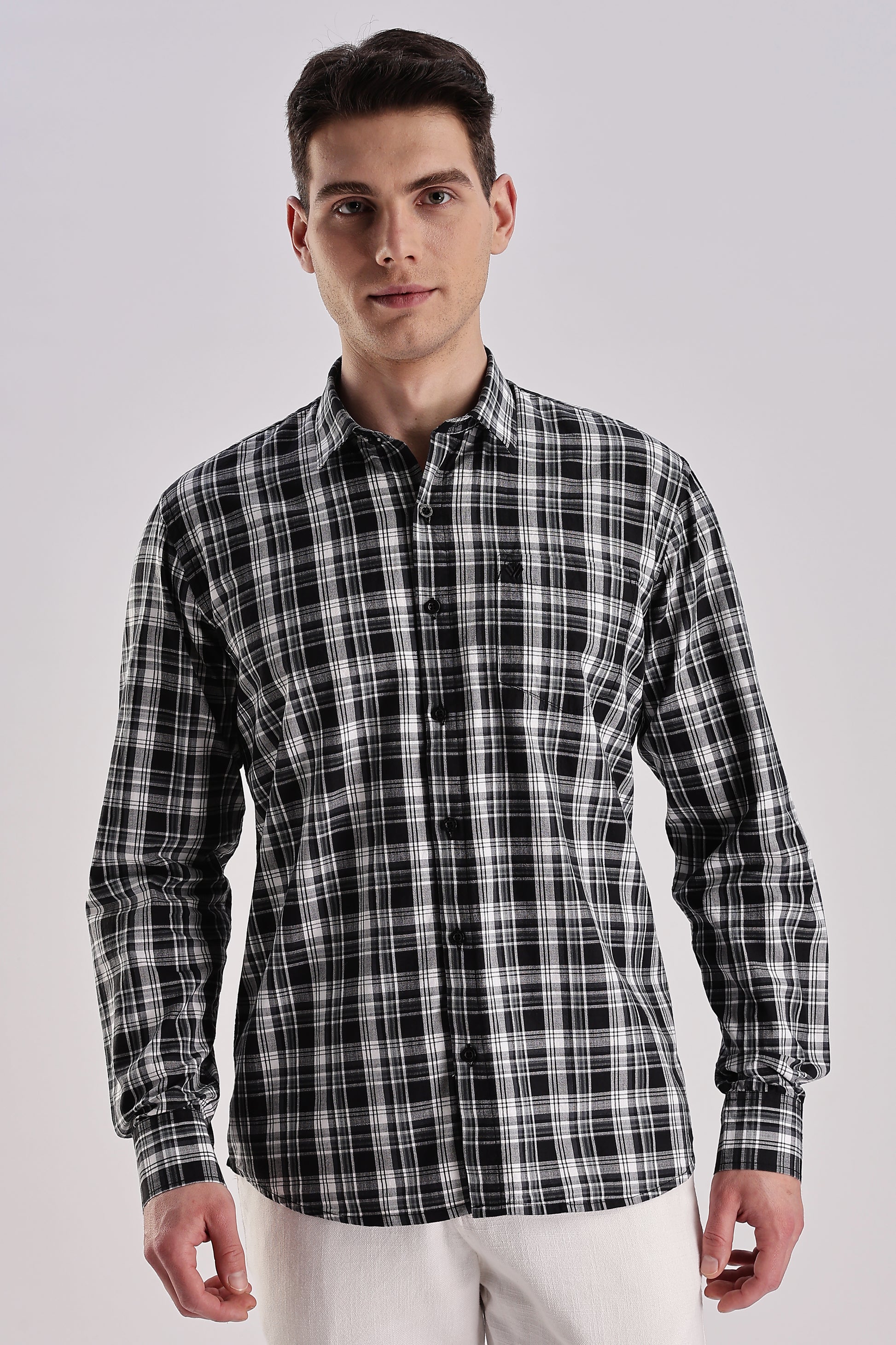 Your wear-anywhere plaid. Cut from a smooth, breathable woven, this shirt features a classic black/white check with grey accents for sharp contrast. A spread collar, full button placket, and single chest pocket (with discreet tonal embroidery) keep it polished enough for work yet relaxed for weekends. Wear it solo or layer over a tee with denim or chinos.