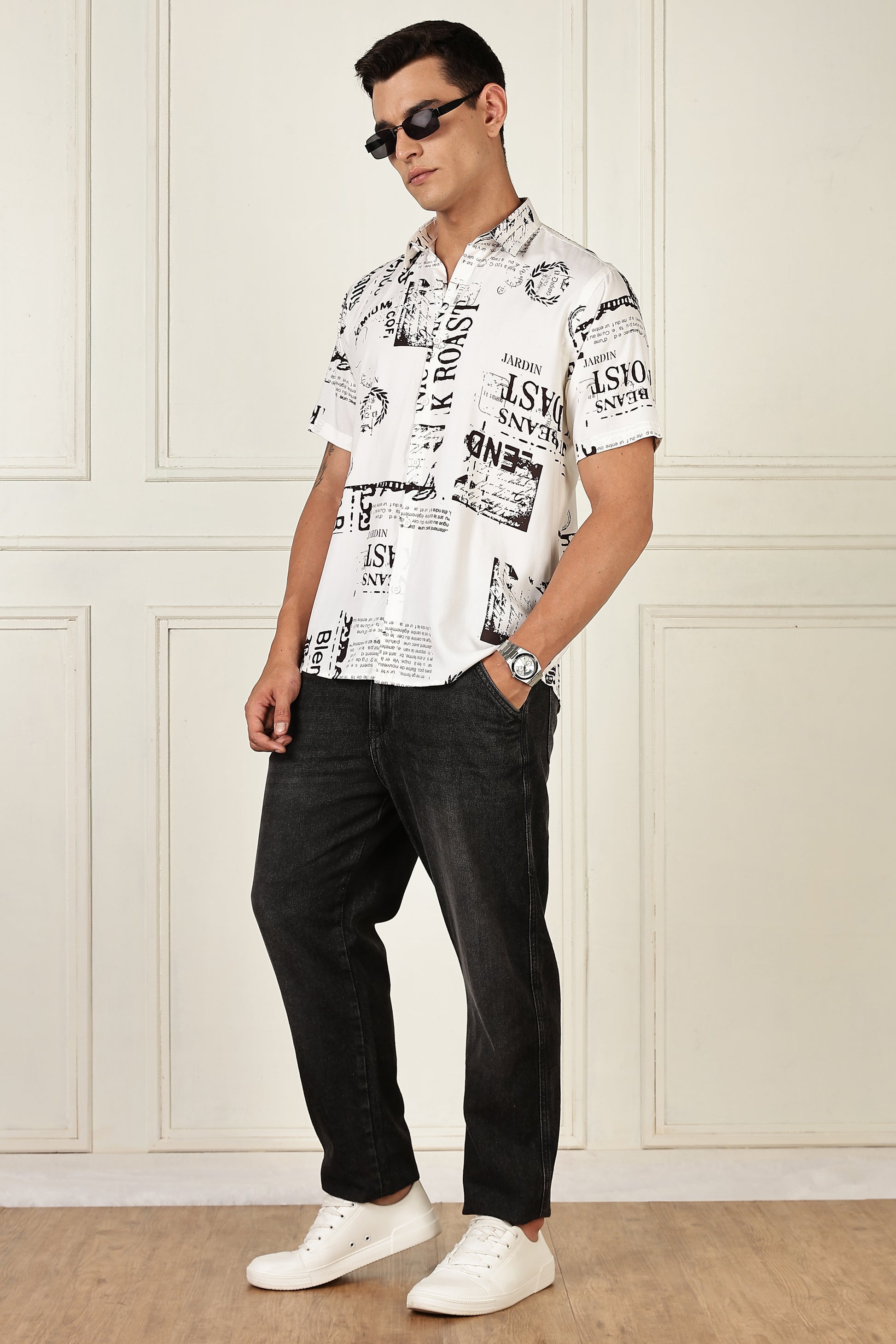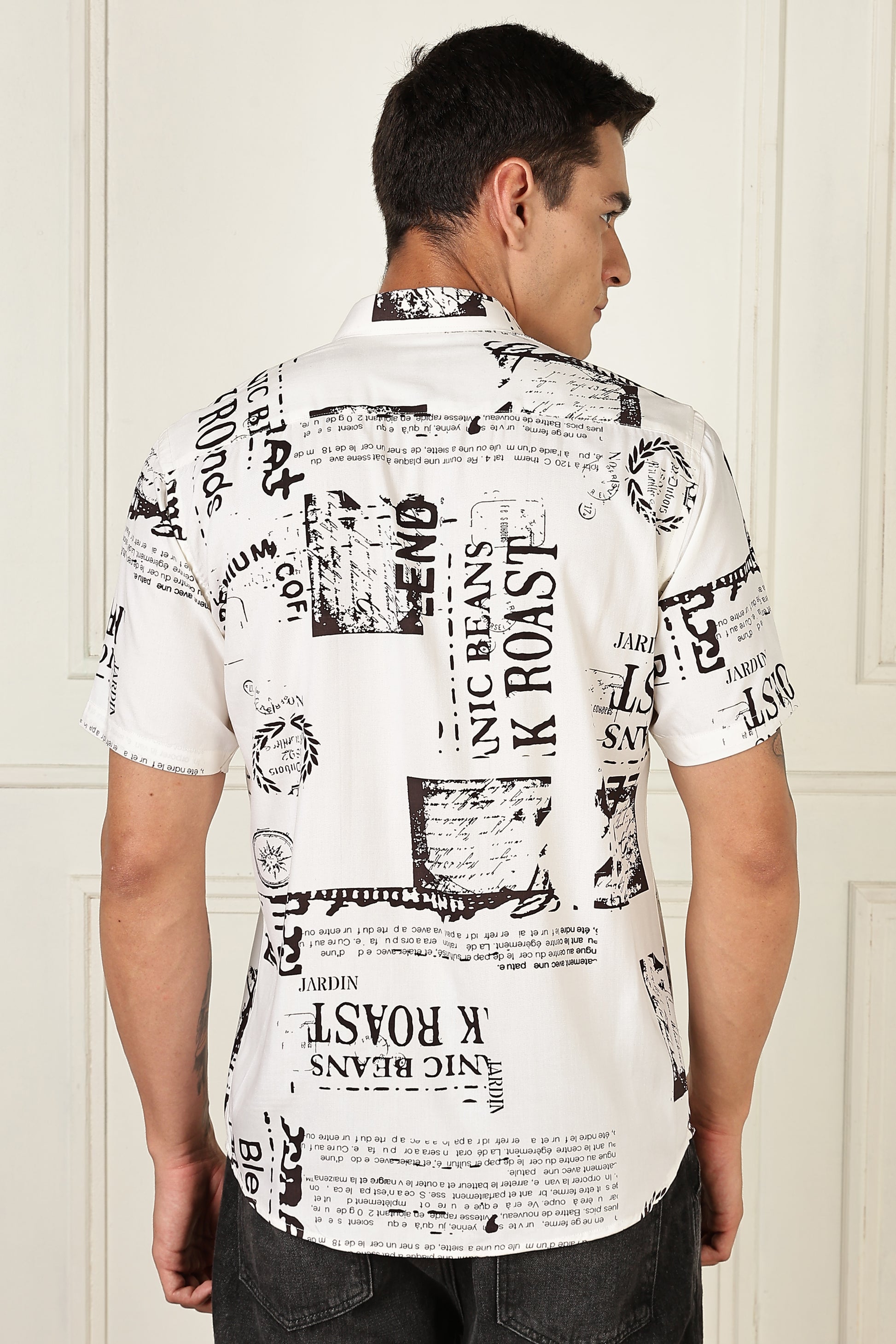 Brew up a statement look. This short-sleeve shirt layers café-inspired headlines, stamps, and label motifs (“beans,” “roast,” etc.) across a clean white base for an editorial, street-ready vibe. A neat spread collar and smooth button placket keep it polished, while the lightweight woven fabric feels comfortable from day plans to night outs. Pair with black denim for edge or ecru chinos for a fresh contrast.