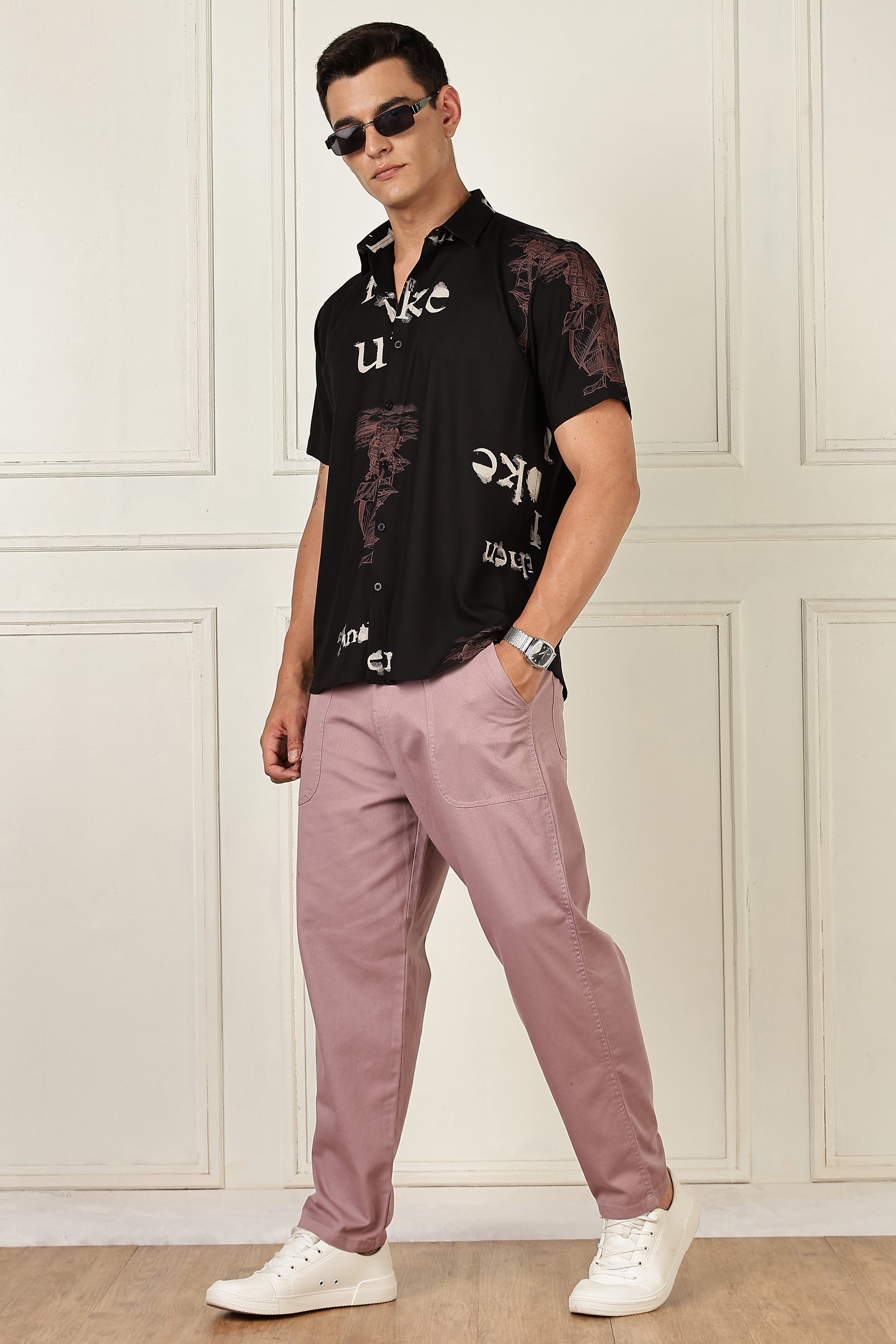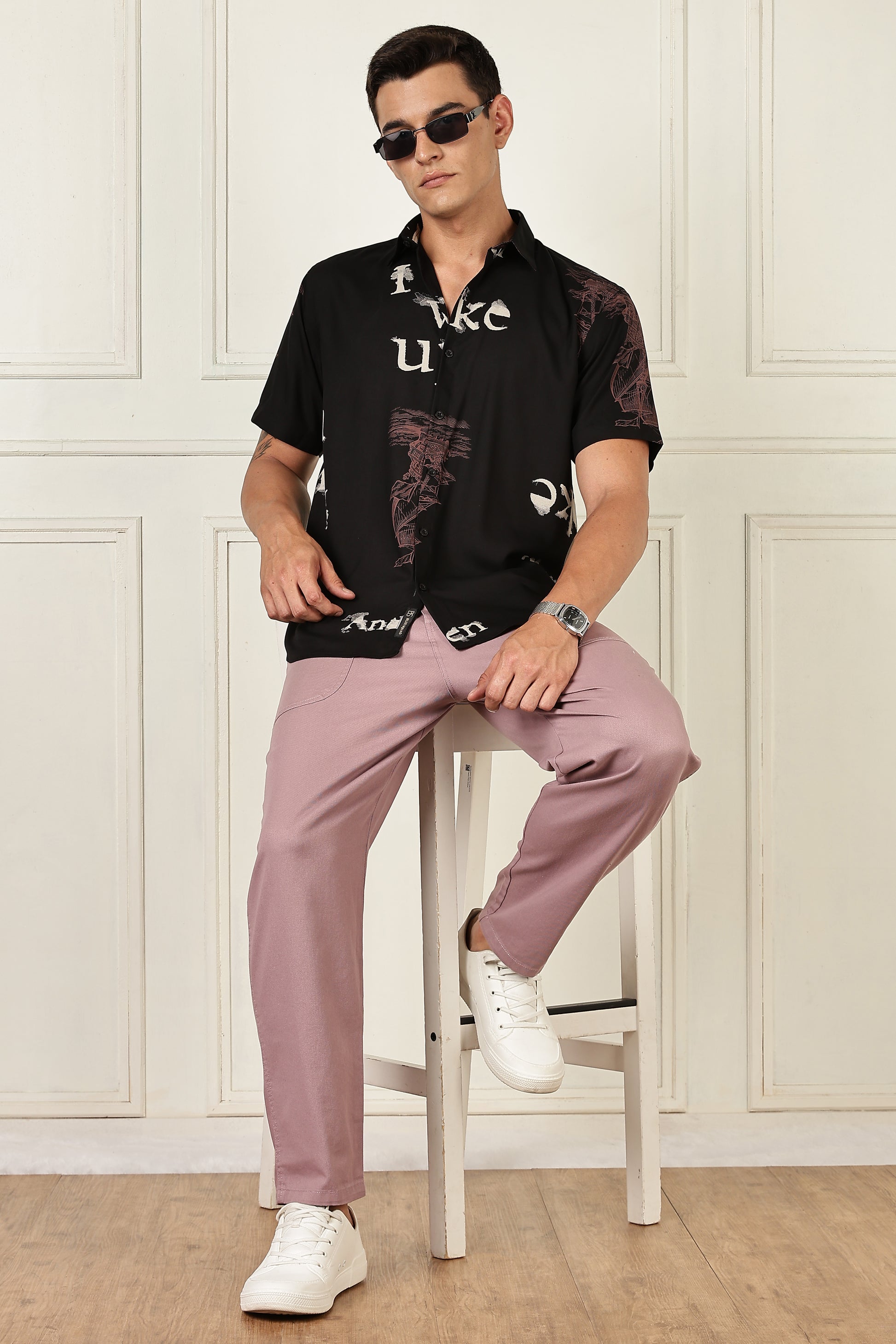 Turn up the graphic energy. This shirt mixes broken-up serif letters with painterly motifs for a bold yet wearable look. The neat spread collar and smooth button placket keep it polished, while the lightweight woven fabric stays comfortable from day plans to night outs. Pair with black denim for a sleek fit or balance it with ecru chinos.
