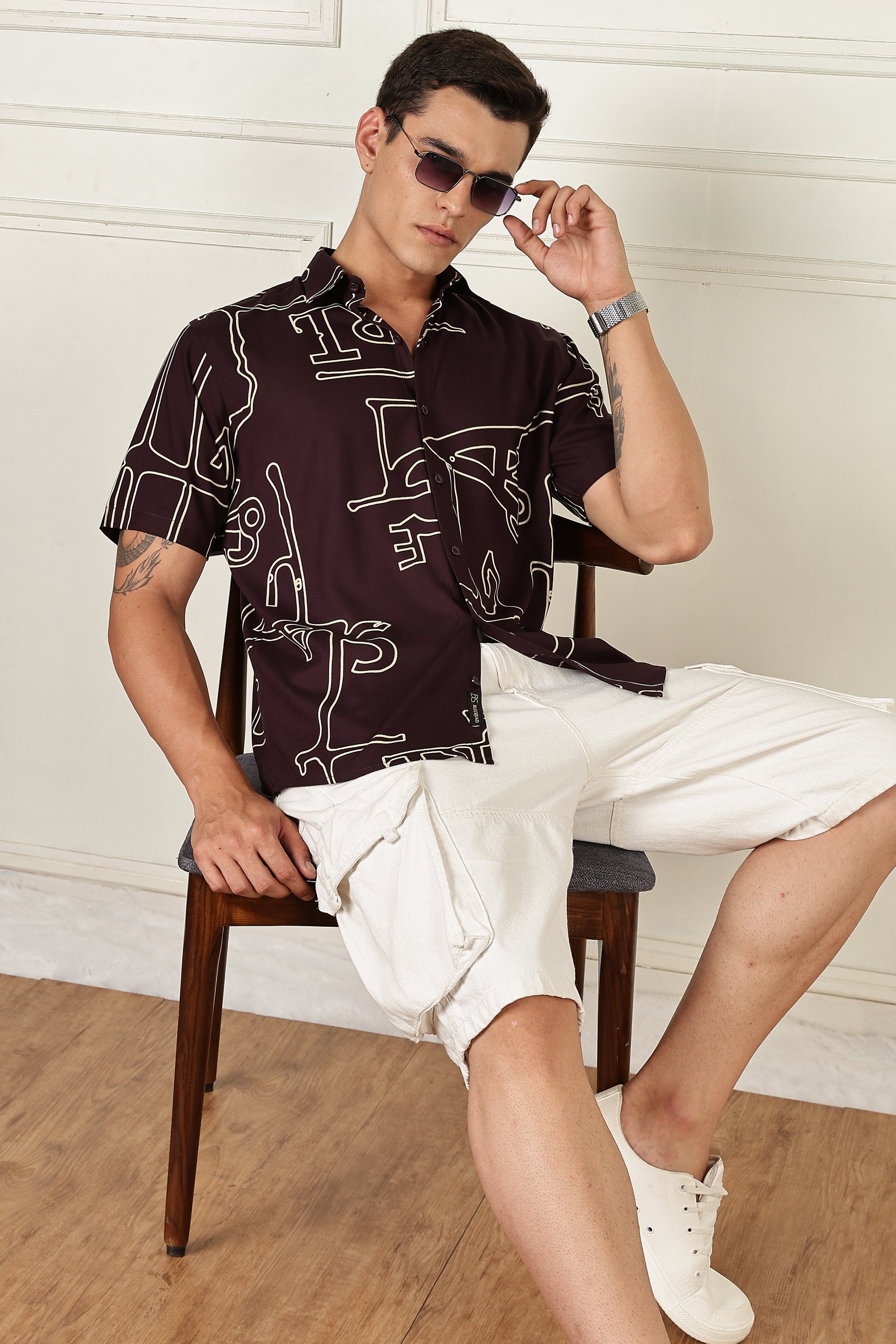 Make a clean statement. This short-sleeve shirt sets bold, sketched linework across a rich burgundy base for a graphic look that reads refined, not loud. A neat spread collar and smooth button placket keep it sharp, while the lightweight woven fabric drapes comfortably from day plans to night outs. Pair with white shorts for contrast or black denim for a sleek party fit.