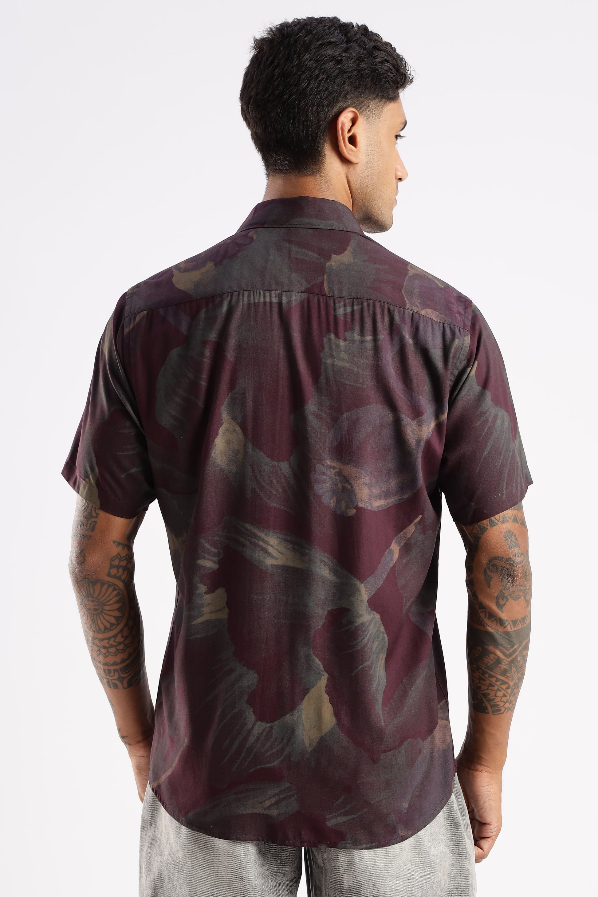 Bring understated print into rotation. This short-sleeve shirt sets soft, brush-painted floral silhouettes across a deep wine base for a look that’s artistic yet polished. A neat spread collar and clean button placket keep it smart, while the smooth, lightweight woven feel stays comfortable from day plans to dinner. Pair with grey denim or ecru chinos for effortless smart-casual style.