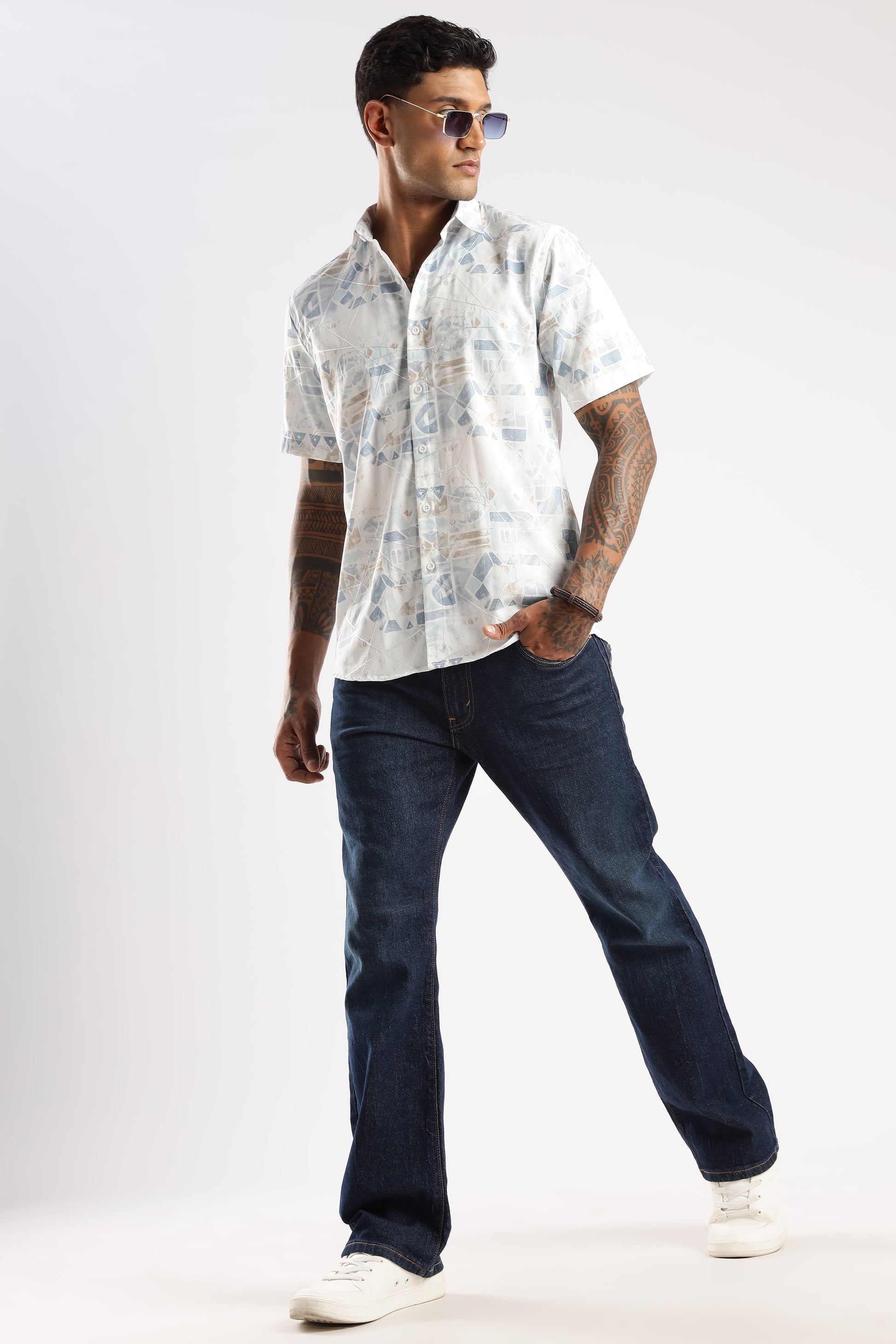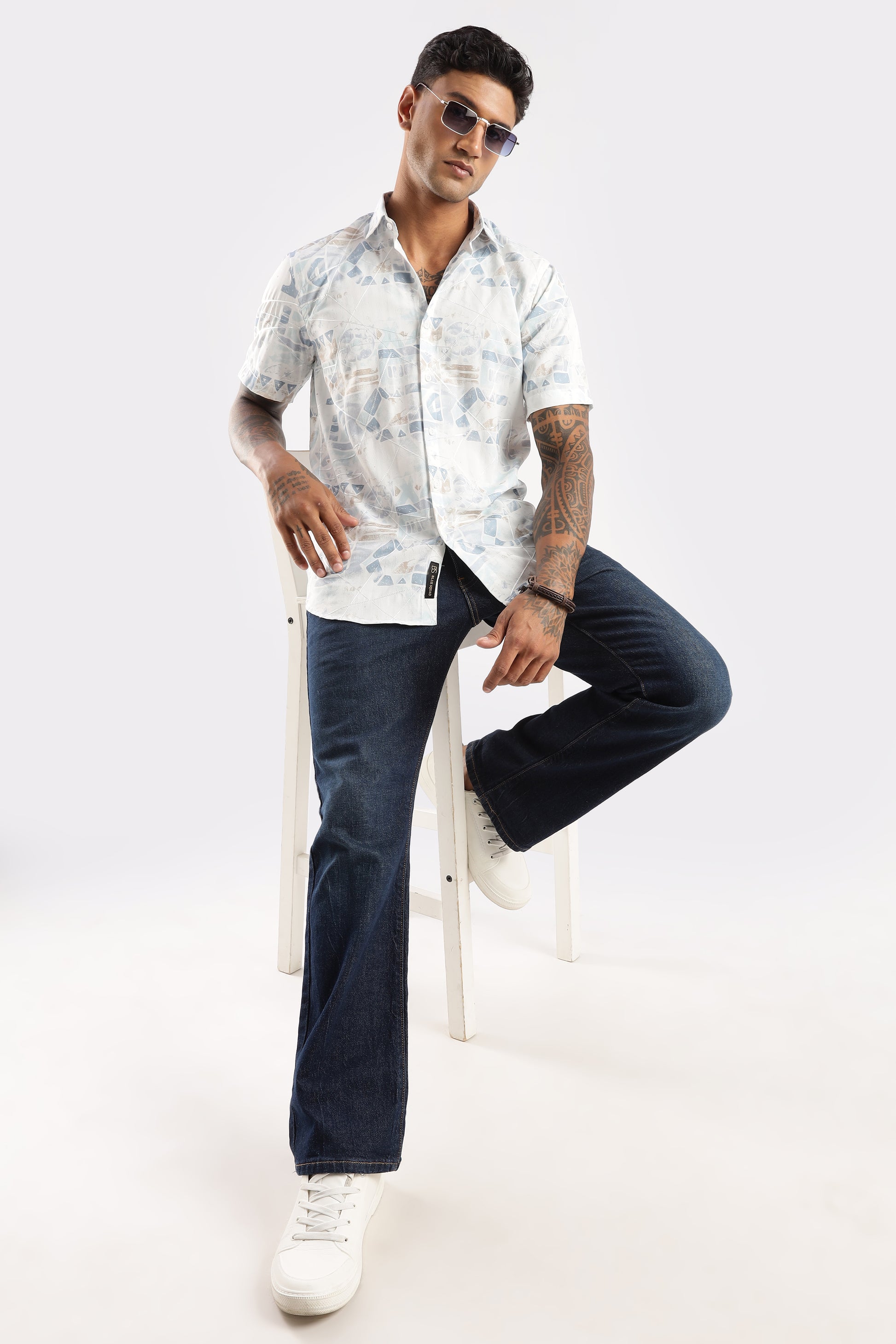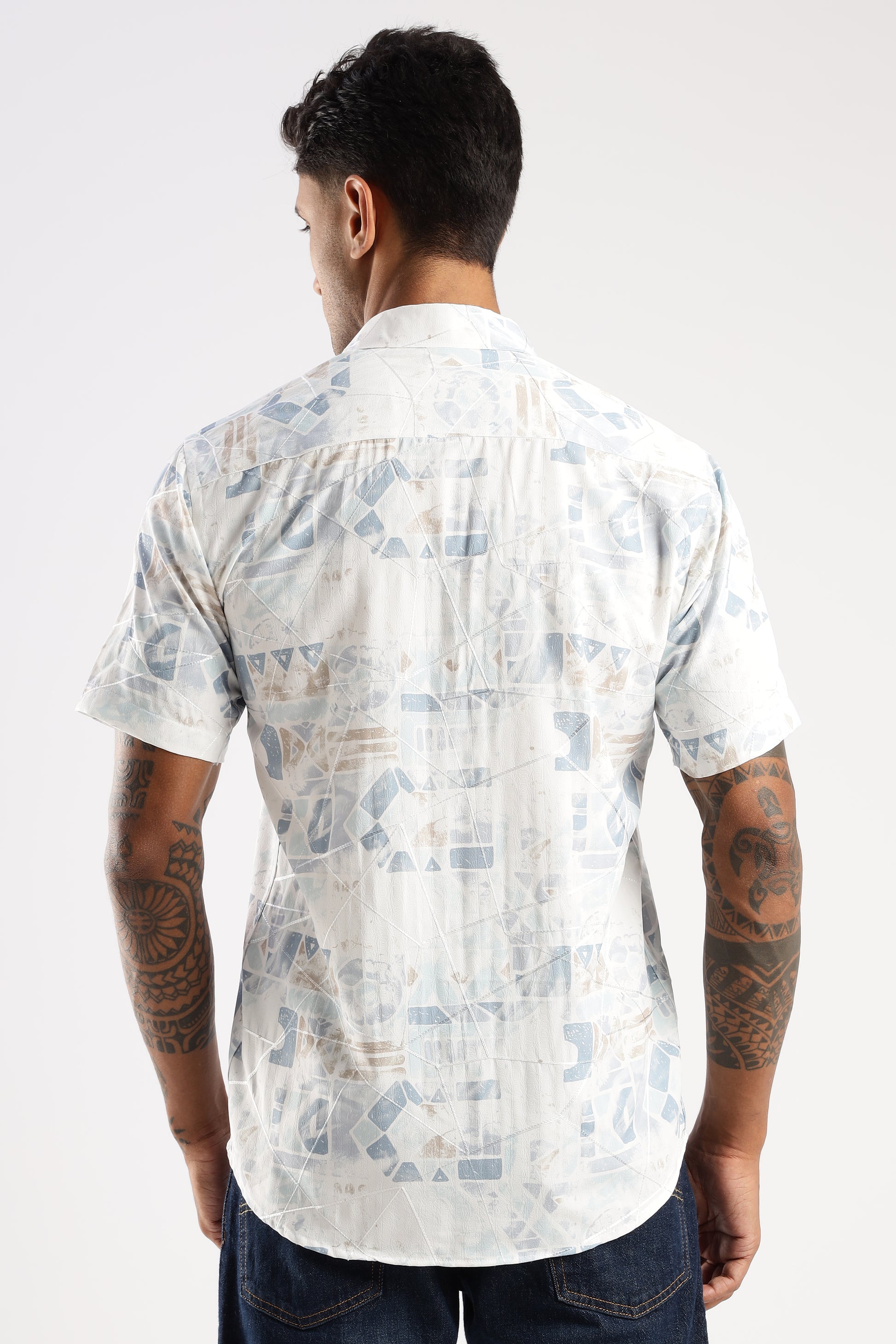 Add quiet pattern without the noise. This short-sleeve shirt features a refined mix of geometric motifs—triangles, arcs and linework—rendered in washed pastel blues and sand over a bright white base. A neat collar and smooth button placket keep it sharp, while the lightweight woven feel stays comfortable from commute to cocktails. Pair with light chinos or dark denim for easy smart-casual style.