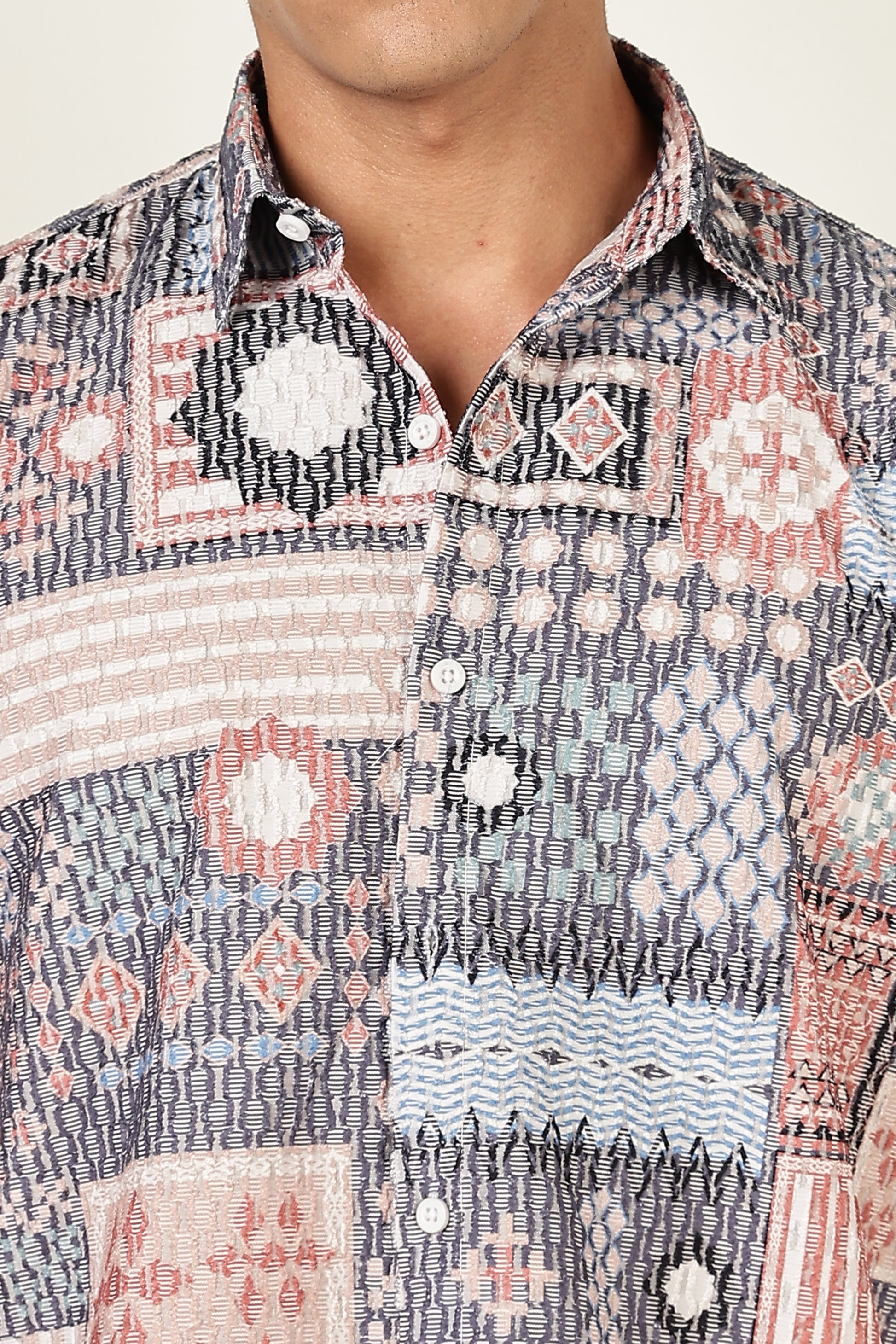 Turn heads with artful texture. This short-sleeve shirt showcases a curated patchwork of patterns—tiles, dots, and geometrics—arranged in a balanced blush-and-slate palette. A neat spread collar, clean button placket, and smooth, lightweight hand keep it polished yet relaxed. Pair it with dark denim or ecru chinos for weekend plans, brunch, or holiday evenings.