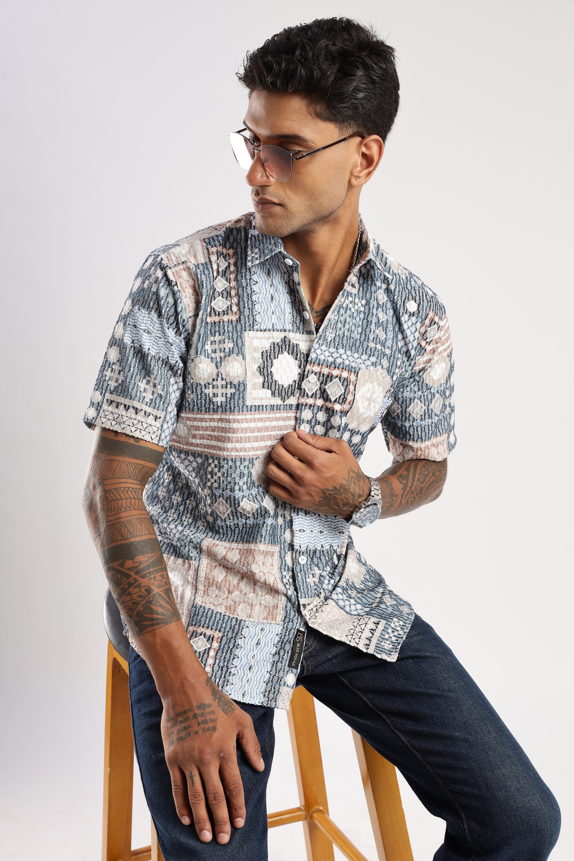 Give your off-duty rotation an artful upgrade. This short-sleeve shirt features a balanced patchwork of heritage-inspired motifs arranged in soft slate and sand tones, with subtle texture that adds depth without feeling loud. Finished with a neat collar and clean button placket, the lightweight woven fabric drapes smoothly and stays comfortable from day plans to dinner. Pair with dark denim or ecru chinos for an effortless, put-together look.